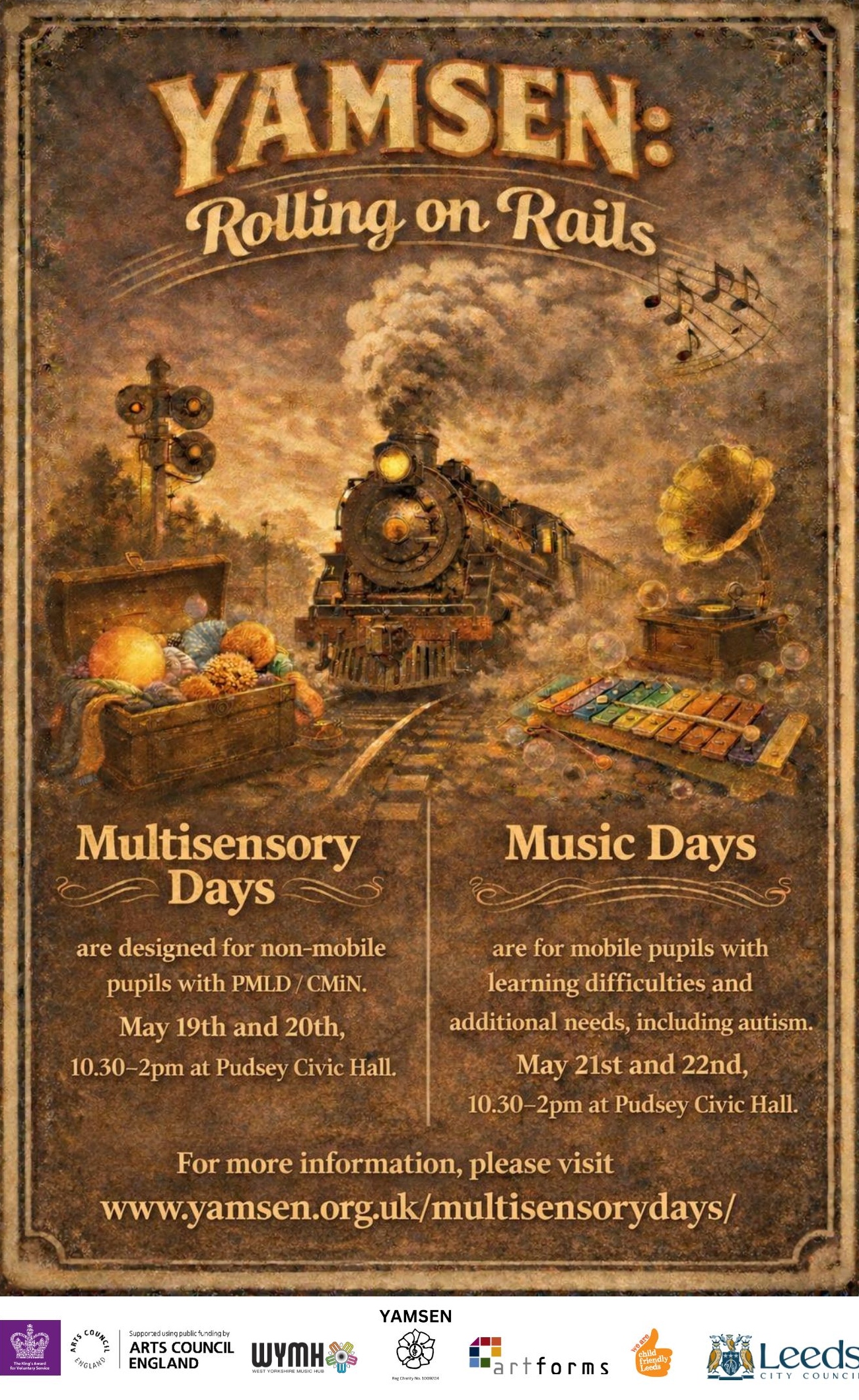 YAMSEN: Rolling on Rails – Multisensory and Music Days – May 2026 at Pudsey Civic Hall. More information and booking form available here