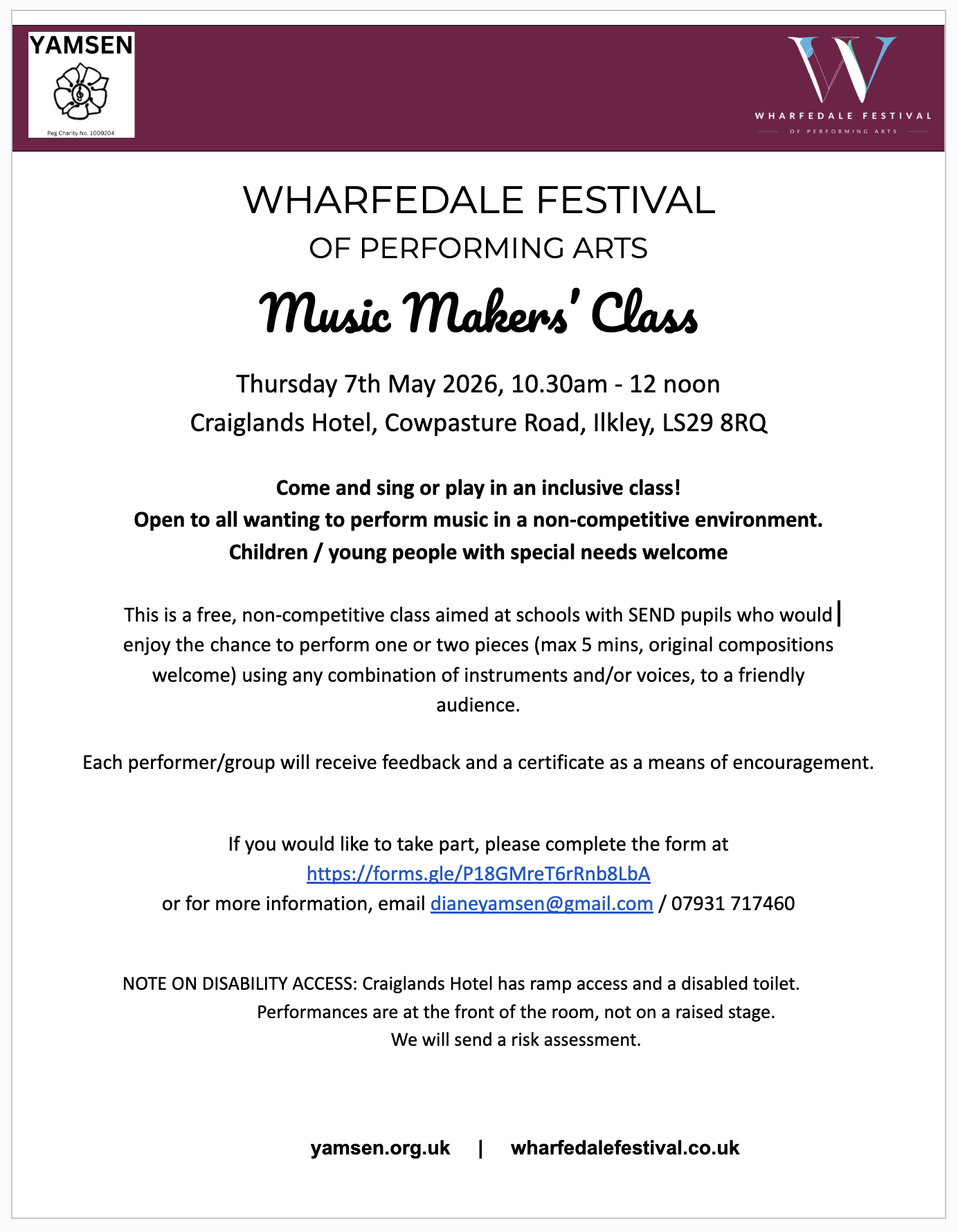 Wharfedale Festival, Music Makers’ Class – 7th May 2026, Craiglands Hotel, Ilkley. More information and booking form available here